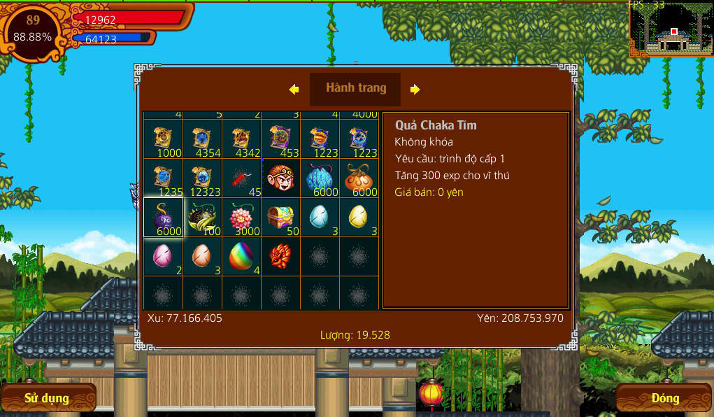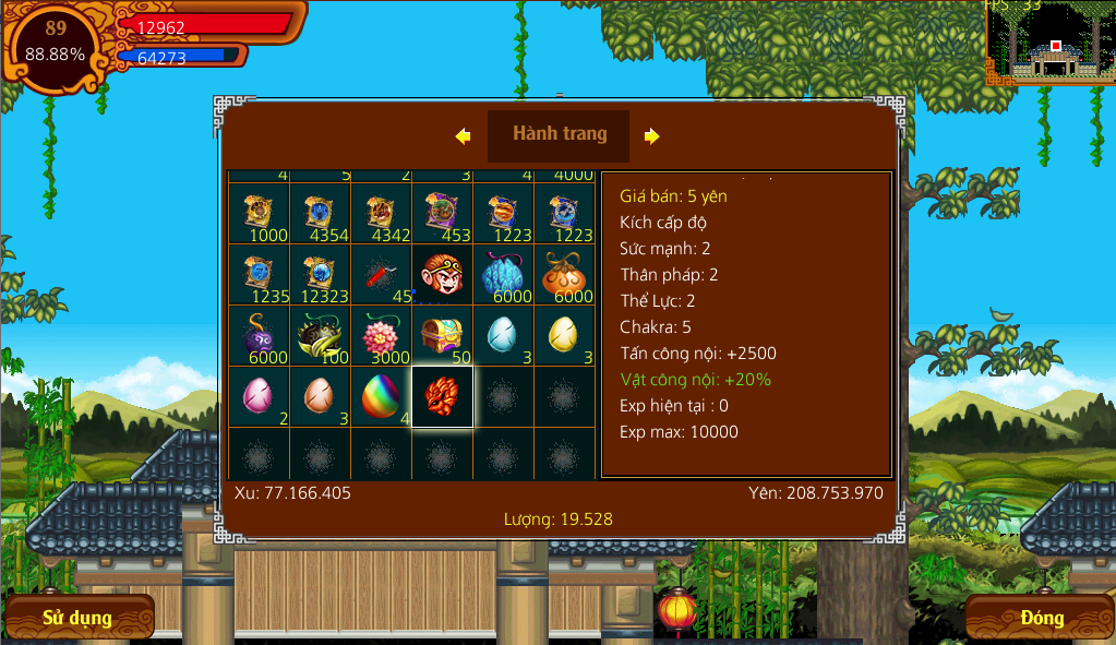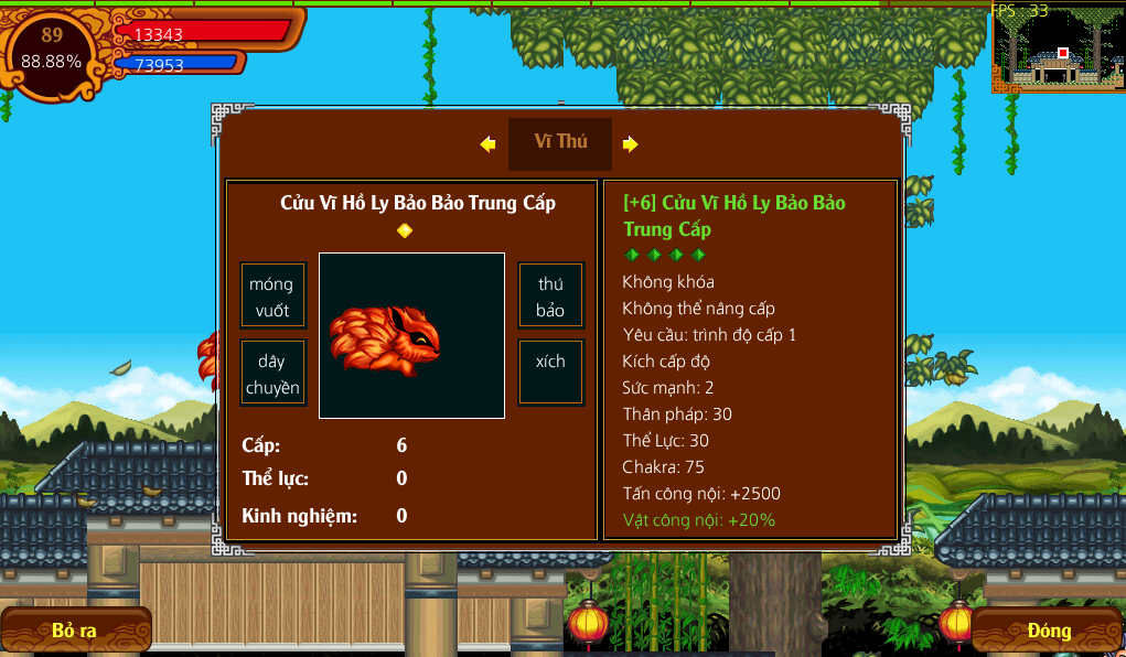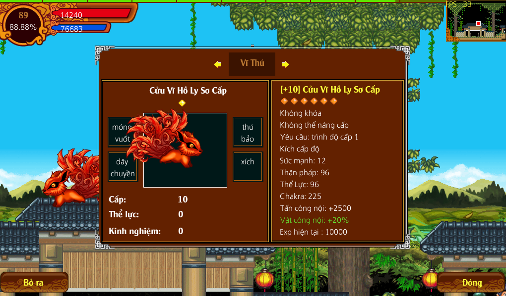 - Quả Chakra giúp Vĩ thú được tăng EXP. Khi đầy EXP bạn có thể sử dụng Ngũ Hành Quả để nâng cấp Vĩ thú